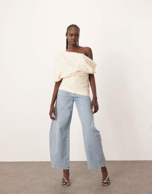 Top color crema asimétrico drapeado de tejido texturizado de ARRANGE