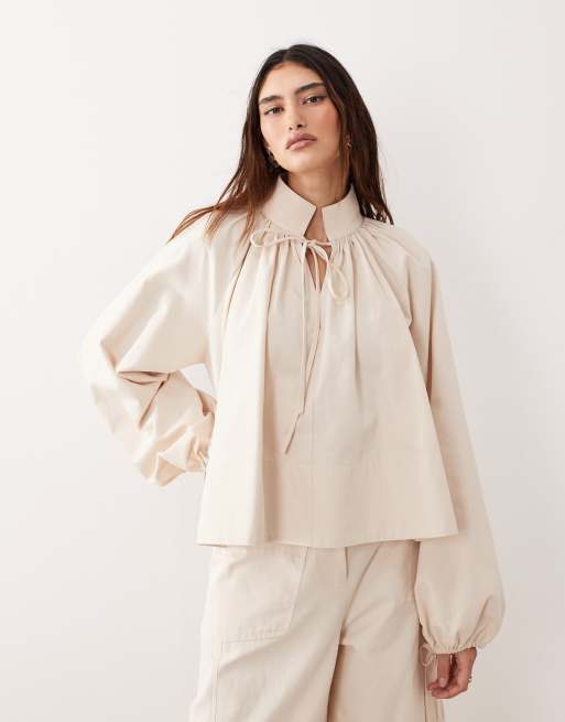 Top color piedra con mangas globo y cuello fruncido de ARRANGE (parte de un conjunto)