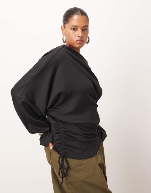 Top negro con hombro caído, mangas anchas y bajo fruncido de punto liso de ARRANGE Curve