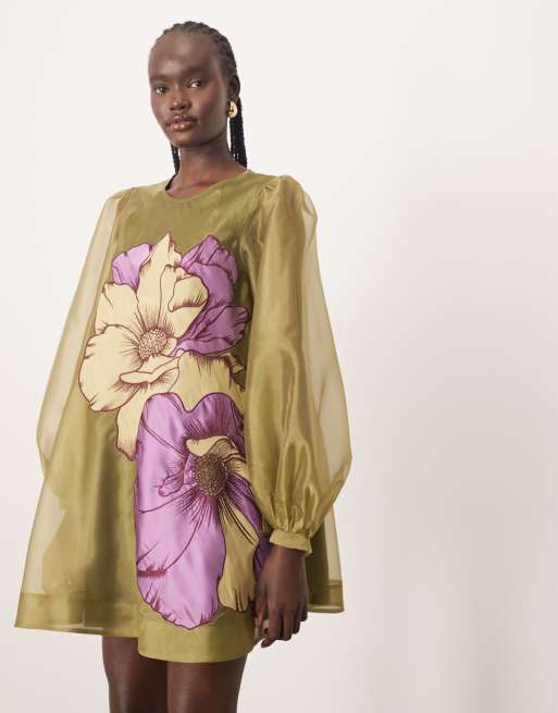 Vestido corto verde acampanado con mangas voluminosas y aplicaciones florales de ARRANGE
