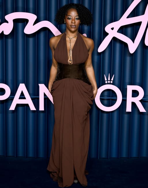 Vestido largo marrón chocolate con cuello halter escotado, cintura entallada y cola de terciopelo de ARRANGE