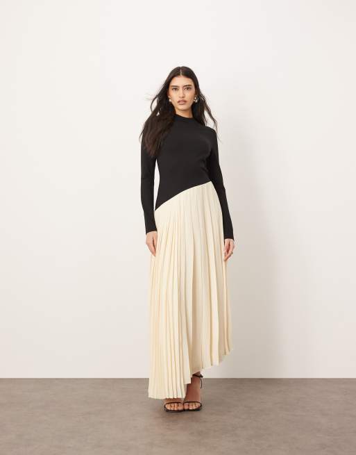 Vestido largo negro con diseño realzador y falda plisada en contraste de ARRANGE