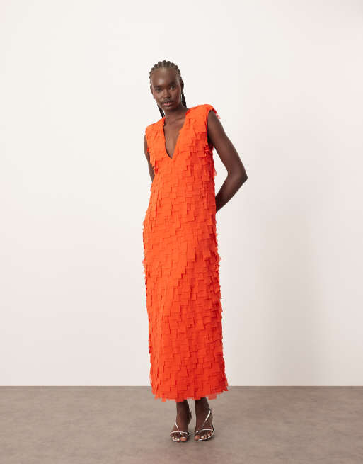 Vestido largo rojo escotado con diseño cortado a láser, hombreras y bolsillos de ARRANGE