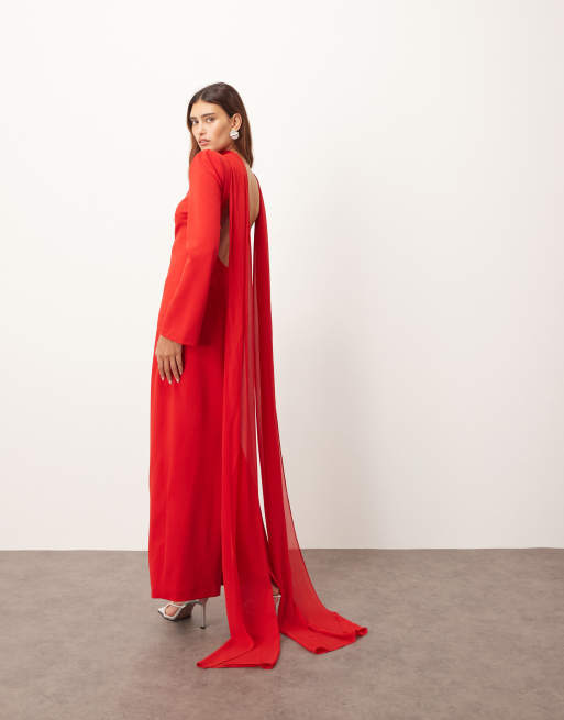 Vestido largo rojo estructurado de manga larga de crepé con capa superior de chifón de ARRANGE