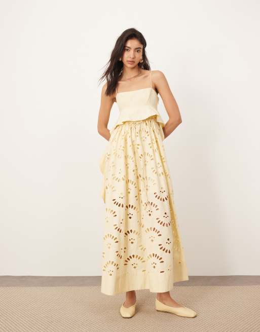 Vestido midi amarillo crema de corte imperio de tirantes con bordado inglés y detalle de volantes en contraste de ARRANGE