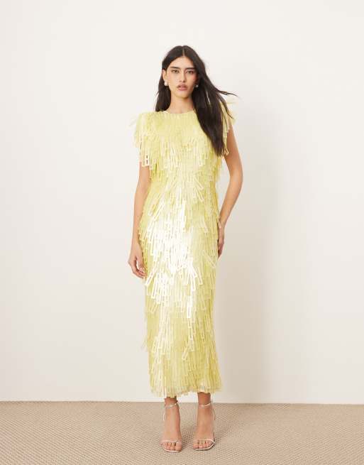 Vestido midi amarillo limón con hombreras y diseño adornado con lentejuelas rectangulares de ARRANGE