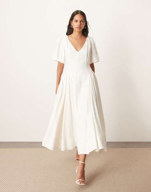Vestido midi blanco con hombros retorcidos de lino premium de ARRANGE