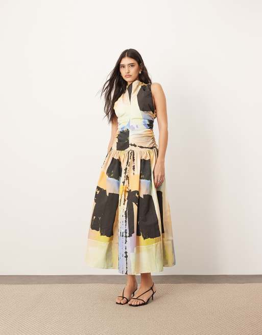 Vestido midi con estampado de pintura, cuello alzado, detalle fruncido y cintura baja de ARRANGE