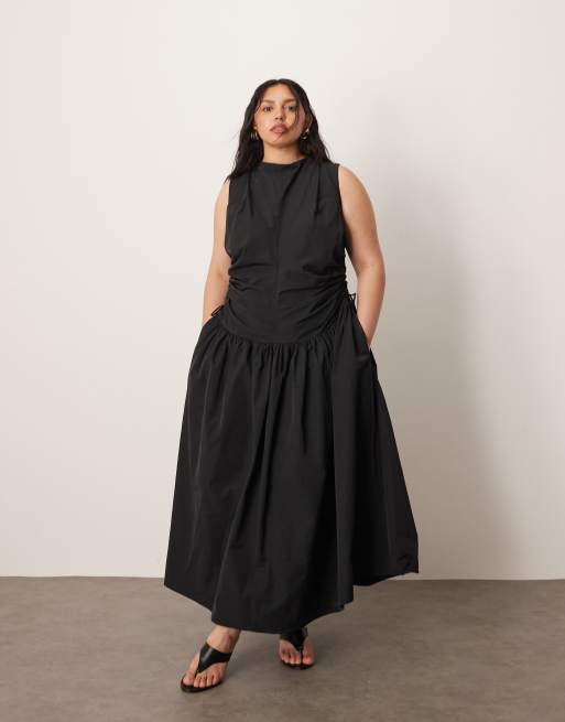 Vestido semilargo negro con cuello alzado, detalle fruncido y cintura baja de ARRANGE Curve