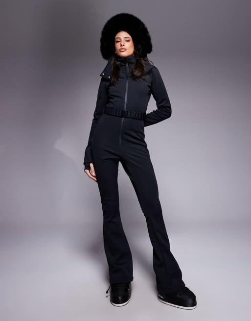 Traje de esquí negro de corte slim acampanado con cinturón de tejido estilo softshell con capucha de piel sintética de ASOS 4505 Ski Tall