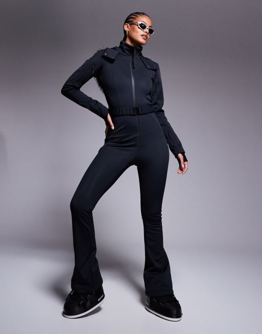 Traje de esquí negro de corte slim acampanado con cinturón y capucha de piel sintética Ski de 4505 Tall