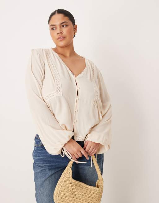 Blusa color piedra de manga larga de tejido texturizado con inserto de encaje de ASOS DESIGN Curve