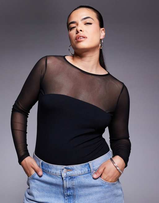 Body negro de manga larga con panel de malla de ASOS DESIGN Curve