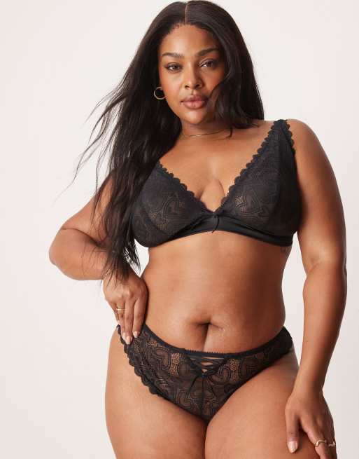 Braguitas brasileñas negras con detalle estilo corsé y patrón de corazones de encaje Blake de ASOS DESIGN Curve