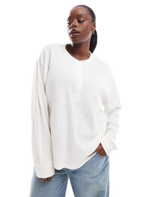 Camiseta color crema extragrande de manga larga con cuello panadero de tejido gofrado de ASOS DESIGN Curve