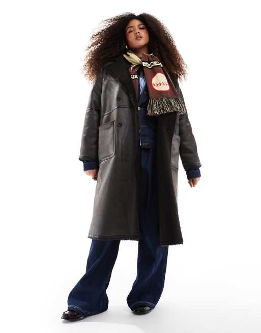 Chaqueta larga marrón con ribetes en contraste de borreguito de ASOS DESIGN Curve