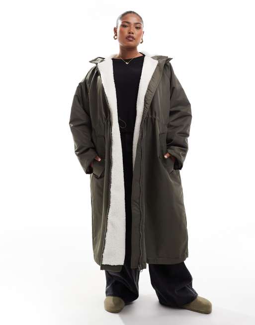 Chubasquero largo caqui con forro de borreguito de ASOS DESIGN Curve