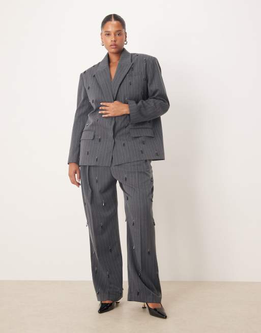 Conjunto gris con raya diplomática de americana de sastre con abalorios y pantalones de pernera ancha de ASOS DESIGN Curve