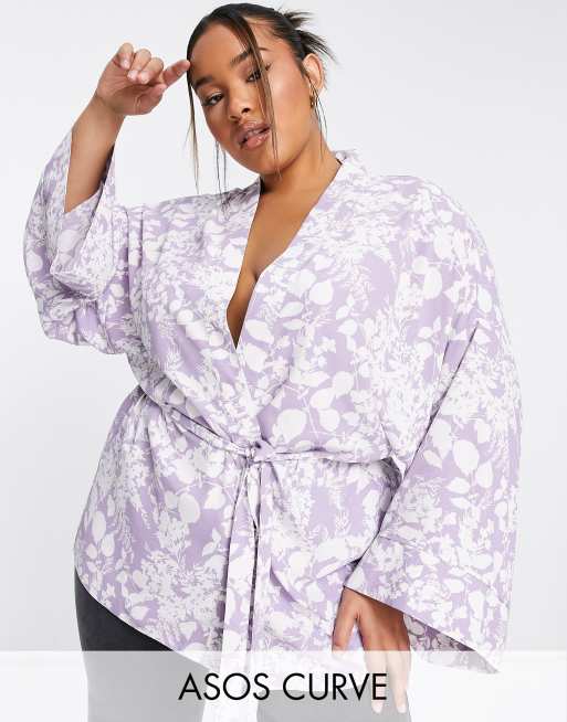 Kimono morado con lazada y estampado floral blanco de ASOS DESIGN Curve