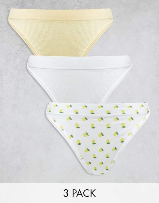 Pack de 3 tangas de color blanco, amarillo limón y con estampado de limones de canalé de ASOS DESIGN