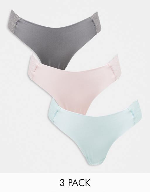 Pack de 3 tangas de color rosa pastel, azul y gris de tejido efecto invisible y encaje en los laterales de ASOS DESIGN