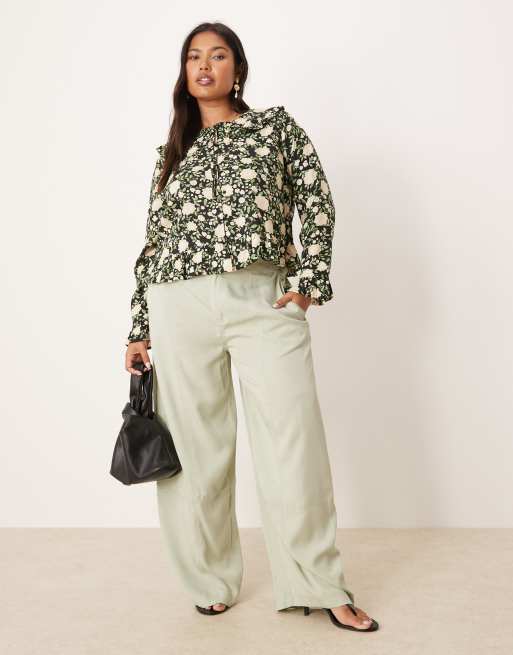 Pantalones verde salvia de pernera barrel con detalle de costuras de tejido suave de ASOS DESIGN Curve