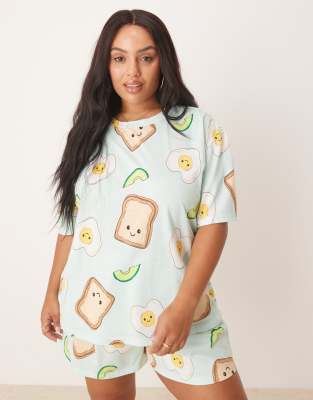 Pijama verde de pantalones cortos y camiseta extragrande con estampado de tostadas, aguacates y huevos de ASOS DESIGN Curve