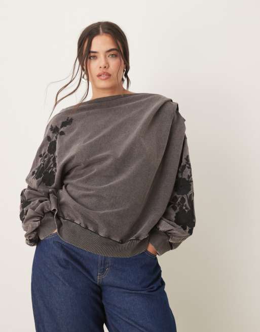 Sudadera negro lavado con escote Bardot y detalle bordado de ASOS DESIGN Curve