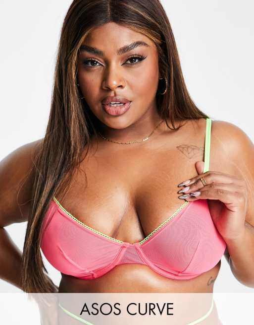 Sujetador rosa con aros y ribetes neón en contraste de malla Madison de ASOS DESIGN Curve