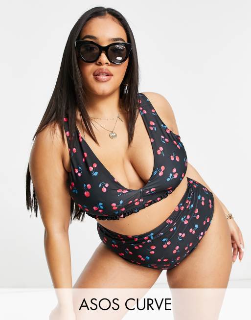 Top de bikini corto con estampado de cerezas y detalle de volantes de ASOS DESIGN Curve