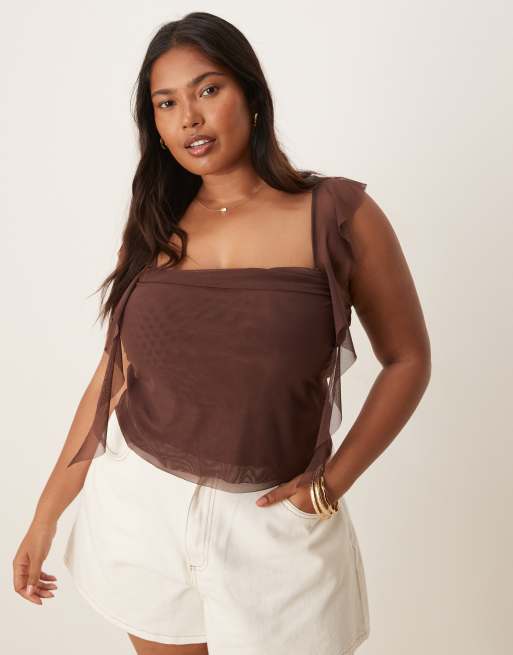 Top marrón chocolate fruncido de tirantes con detalles vaporosos de malla de ASOS DESIGN Curve