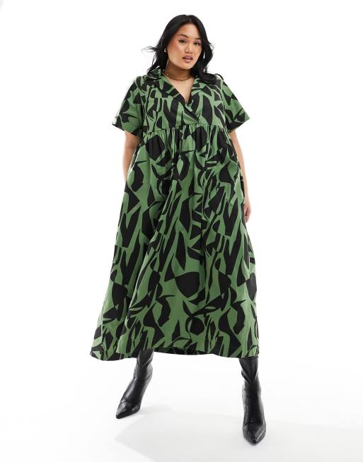 Vestido camisero midi caqui amplio con cuello de solapas y estampado abstracto de ASOS DESIGN Curve