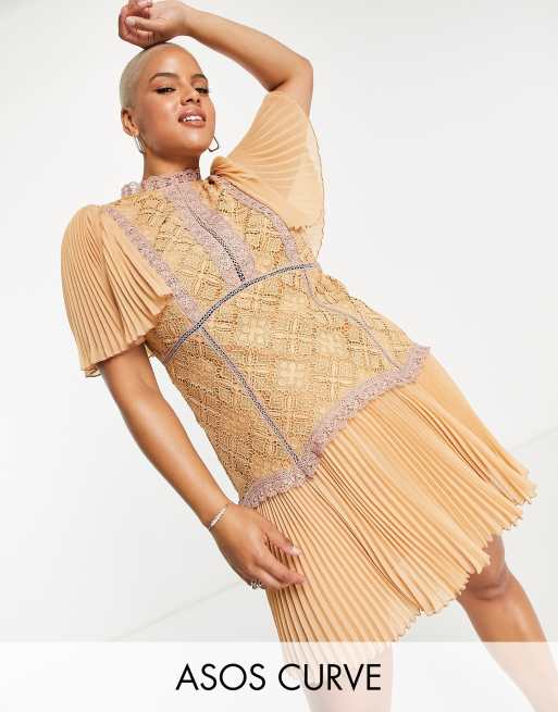 Vestido corto con ribetes de encaje en contraste y mangas acampanadas plisadas de ASOS DESIGN Curve