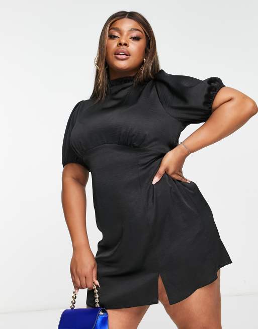Vestido corto negro con cuello alto y mangas abullonadas de satén de ASOS DESIGN Curve