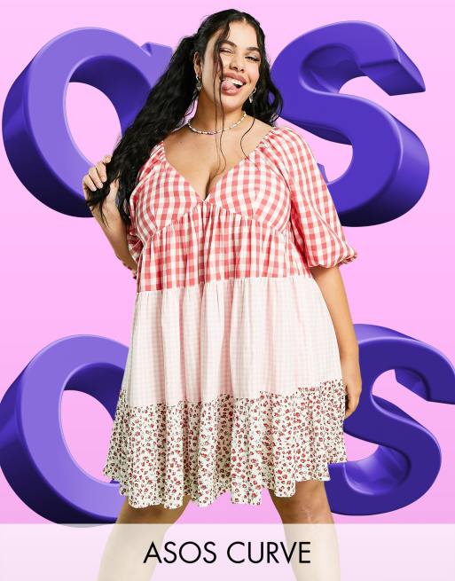 Vestido corto y amplio con diseño escalonado y estampado combinado de cuadros vichy y flores de ASOS DESIGN Curve