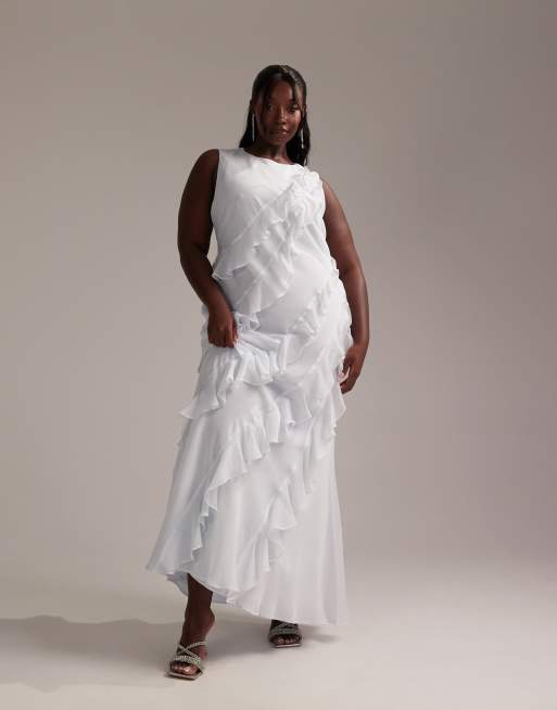 Vestido de dama de honor largo azul claro de corte al bies con cuello de nadadora y volantes de ASOS DESIGN Curve