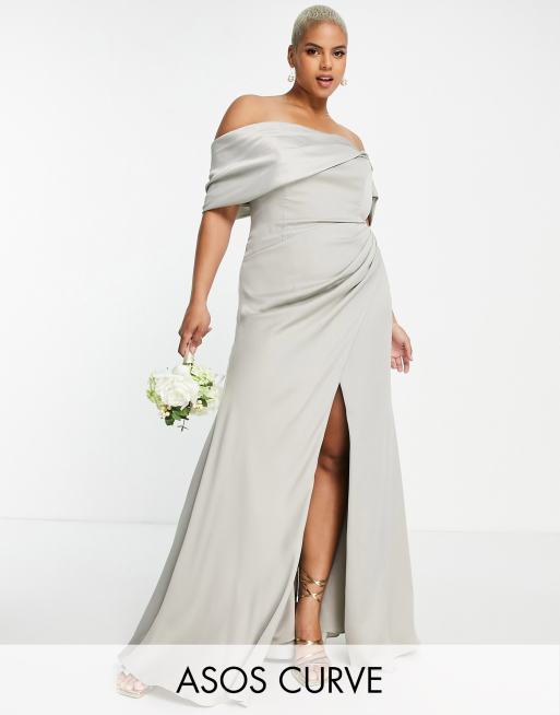Vestido de dama de honor largo verde salvia cruzado con escote Bardot drapeado de satén de ASOS DESIGN Curve