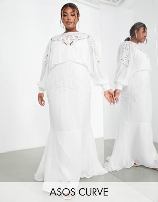Vestido de novia color crema con mangas estilo blusón y diseño calado con cuentas Ella de ASOS DESIGN Curve