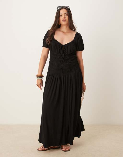 Vestido de tarde midi negro de estilo mesonera con mangas abullonadas y cintura fruncida de tejido rugoso de ASOS DESIGN Curve