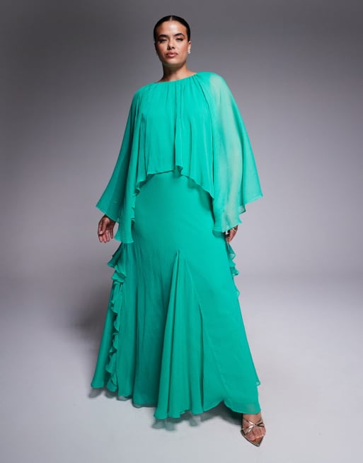 Vestido largo aguamarina luminoso de corte trapecio con capa superpuesta y volantes de chifón de ASOS DESIGN Curve