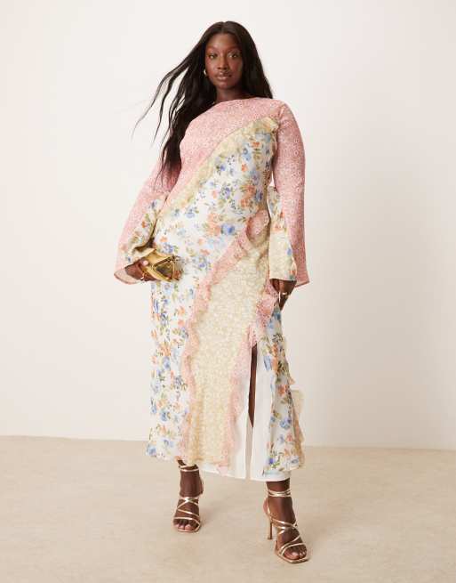 Vestido largo con estampado floral, diseño dividido, volantes y detalle de costuras de ASOS DESIGN Curve