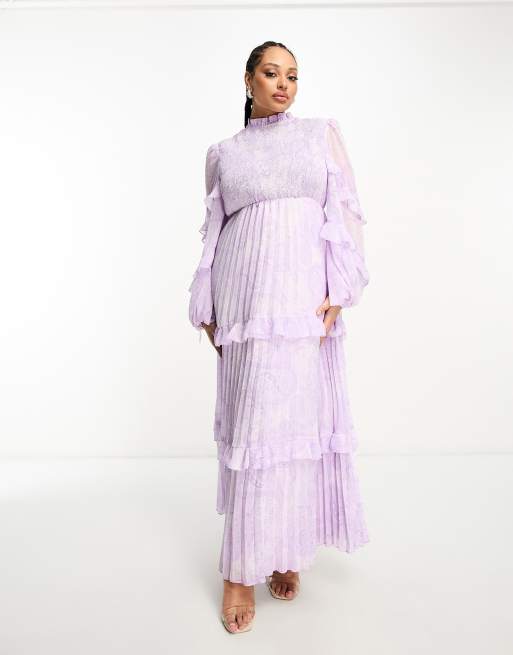 Vestido largo fruncido y plisado de cuello alto con bordes de volantes con diseño de cachemir de ASOS DESIGN Curve
