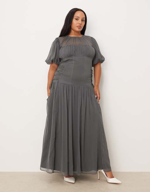 Vestido largo gris carbón con mangas abullonadas de chifón de ASOS DESIGN Curve