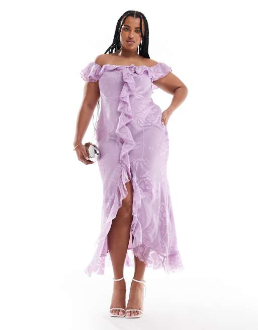 Vestido largo lila de corte al bies con estampado floral, escote Bardot y volantes delanteros de jacquard de ASOS DESIGN Curve
