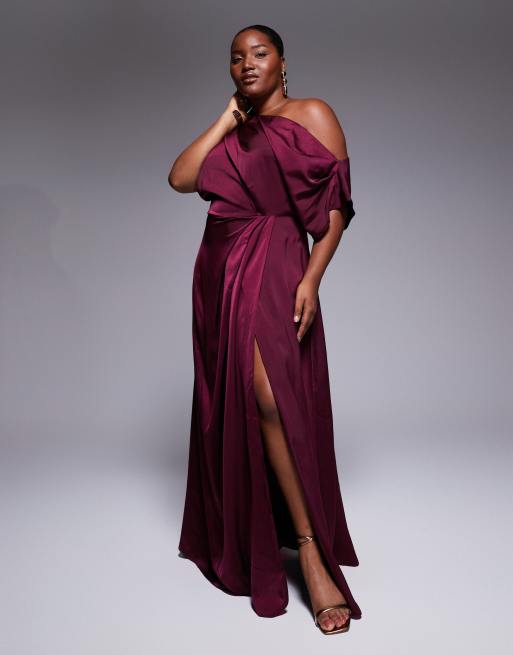Vestido largo morado intenso con hombro caído y abertura lateral de satén exclusivo de ASOS DESIGN Curve
