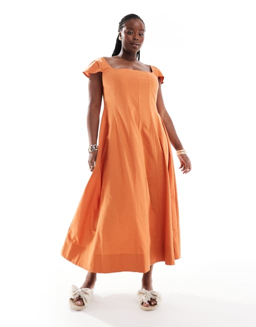 Vestido largo naranja mango oscuro de estilo tenista con mangas de casquillo y detalle de costuras de ASOS DESIGN Curve