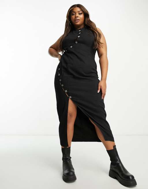 Vestido largo negro asimétrico con detalle de abertura y botones de efecto cuerno de ASOS DESIGN Curve