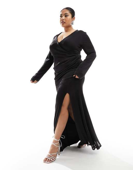 Vestido largo negro escotado con mangas ángel de tejido semitransparente estilo cota de malla de ASOS DESIGN Curve