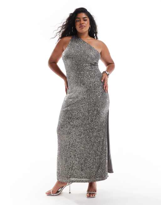 Vestido largo plateado asimétrico con detalle de tira en la espalda de lentejuelas de ASOS DESIGN Curve