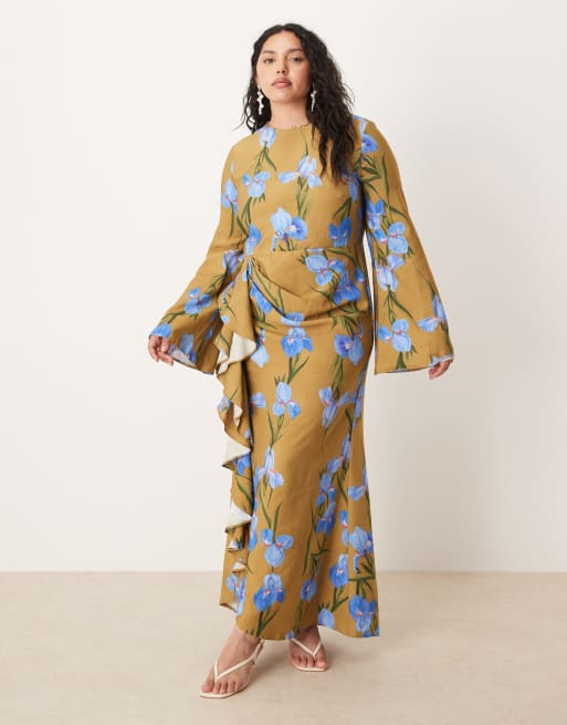 Vestido largo verde de manga larga con falda de volantes y estampado floral extragrande de ASOS DESIGN Curve